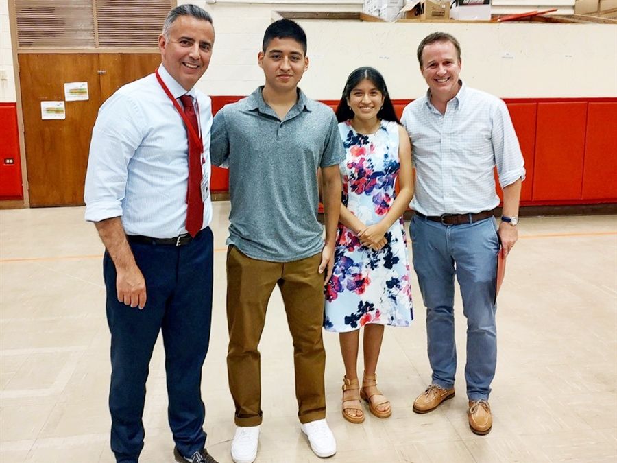 Mr. Sykes (far right) with TUFSD superintendent Dr. Ray Sanchez and two twelfth grade Hudson Scholars who returned to be mentors in the program.