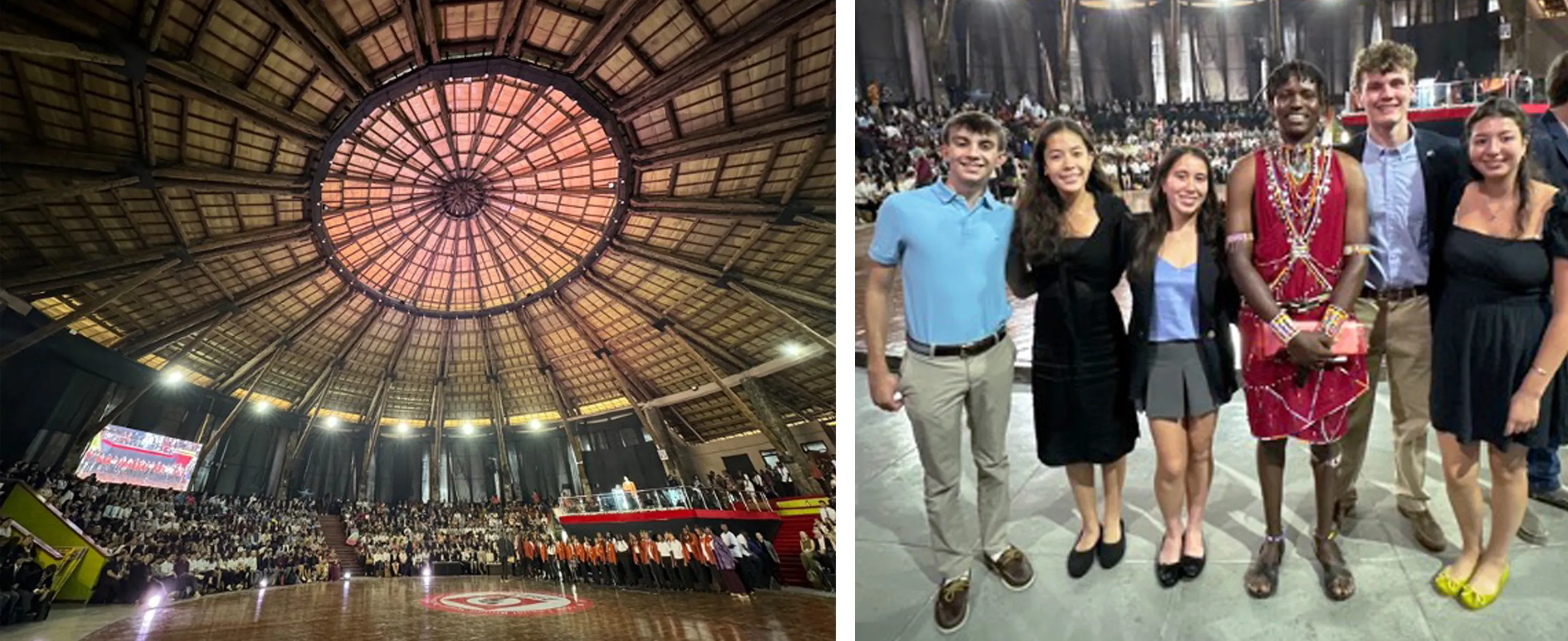 Left: The view inside Bomas of Kenya, site of the Round Square International Conference opening ceremonies. Right: Hackley student delegates with Brookhouse alum and opening ceremony speaker Richard Turere.