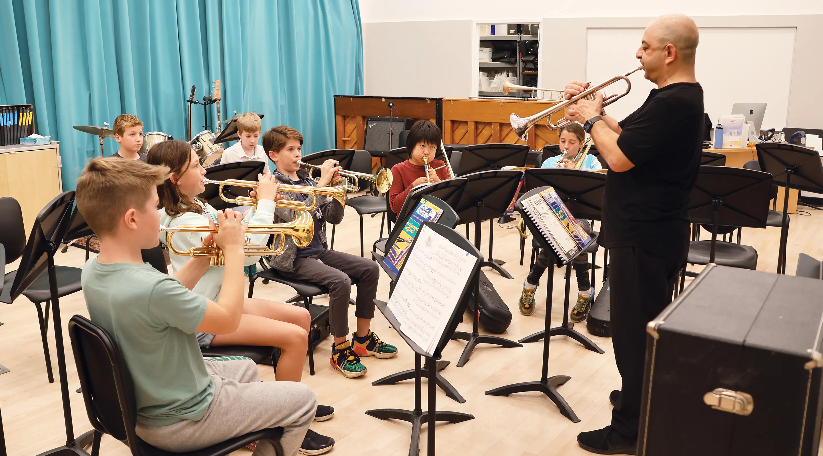 Performing Arts teacher Dr. Rafi Malkiel and Middle School band students practice in the new Center.