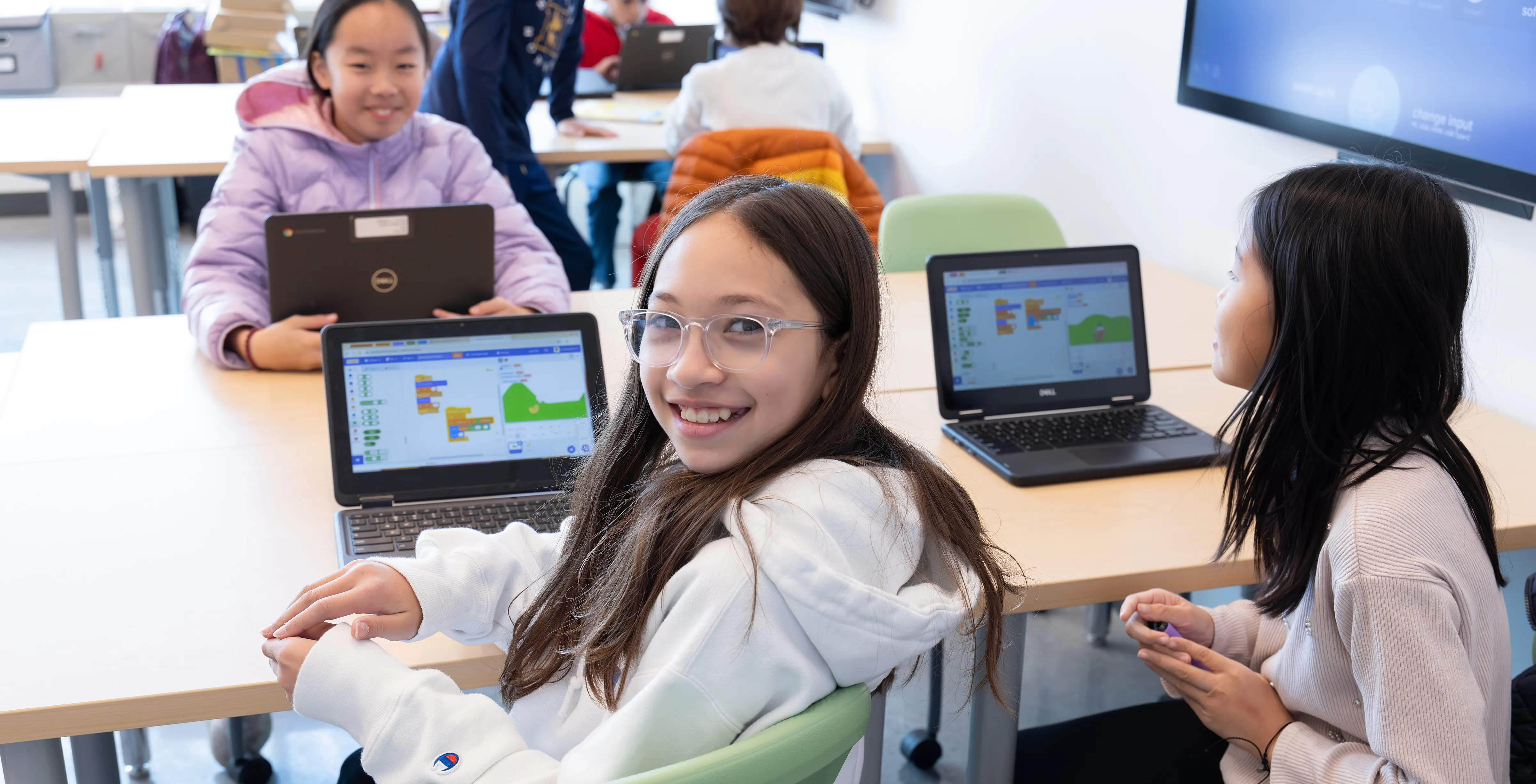 Fifth grade computer science students in Ms. Powers’ class enjoy their new classroom in the Center.