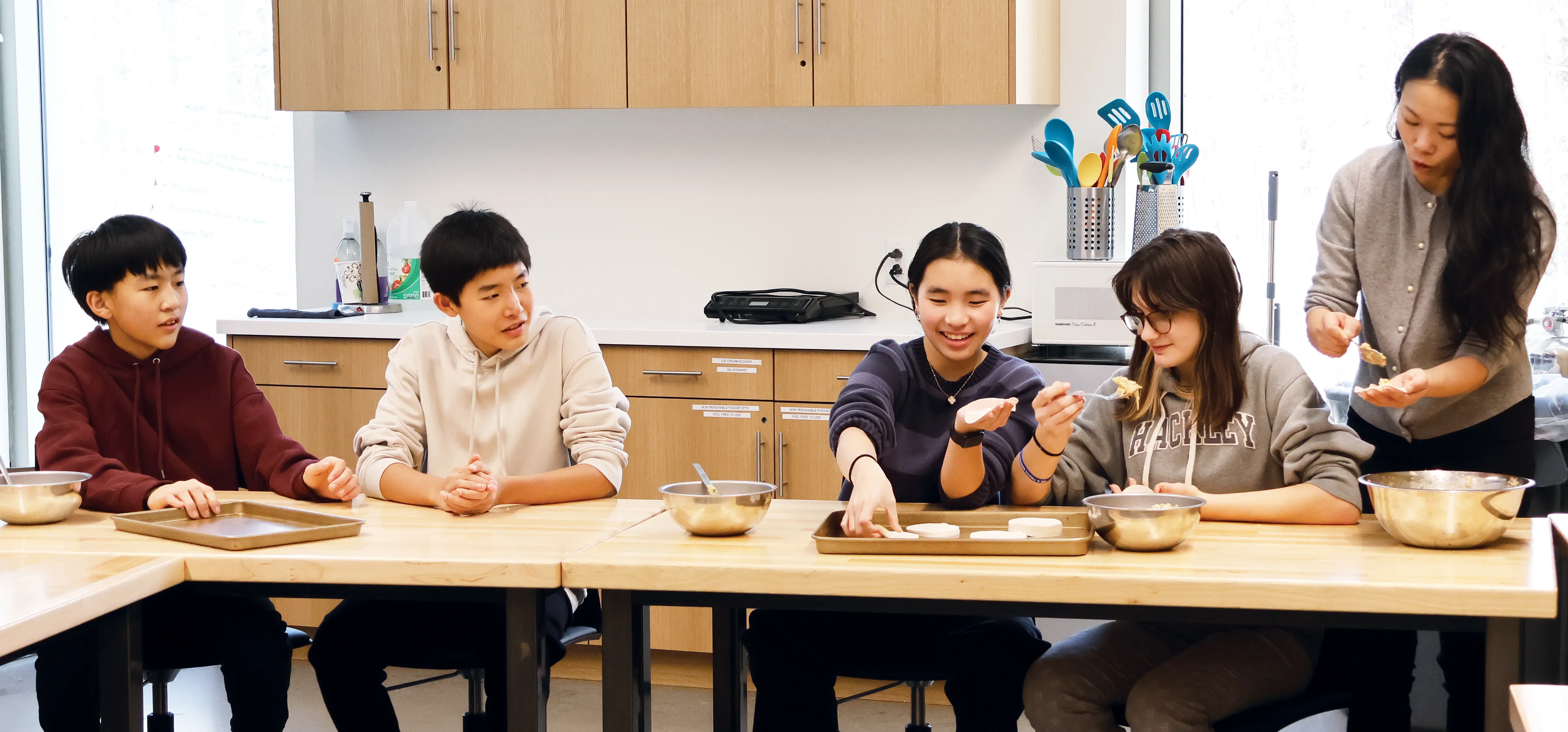 Chinese language teacher Qiong (Katie) Jan (far right) makes dumplings with eighth grade students in the Johnson Center test kitchen.