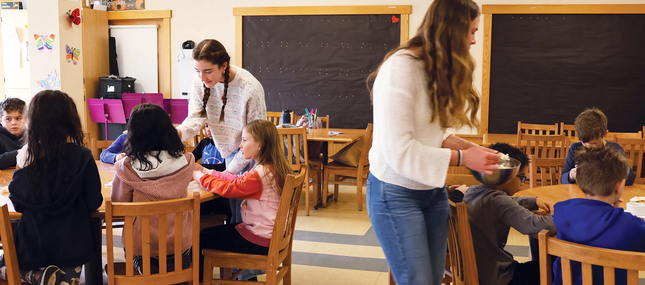Emerson Pedraza ’28 and Cadey Mook ’28 teach third graders how to make dumplings as a way to promote and drum up interest for the Chinese language program in the Lower School.