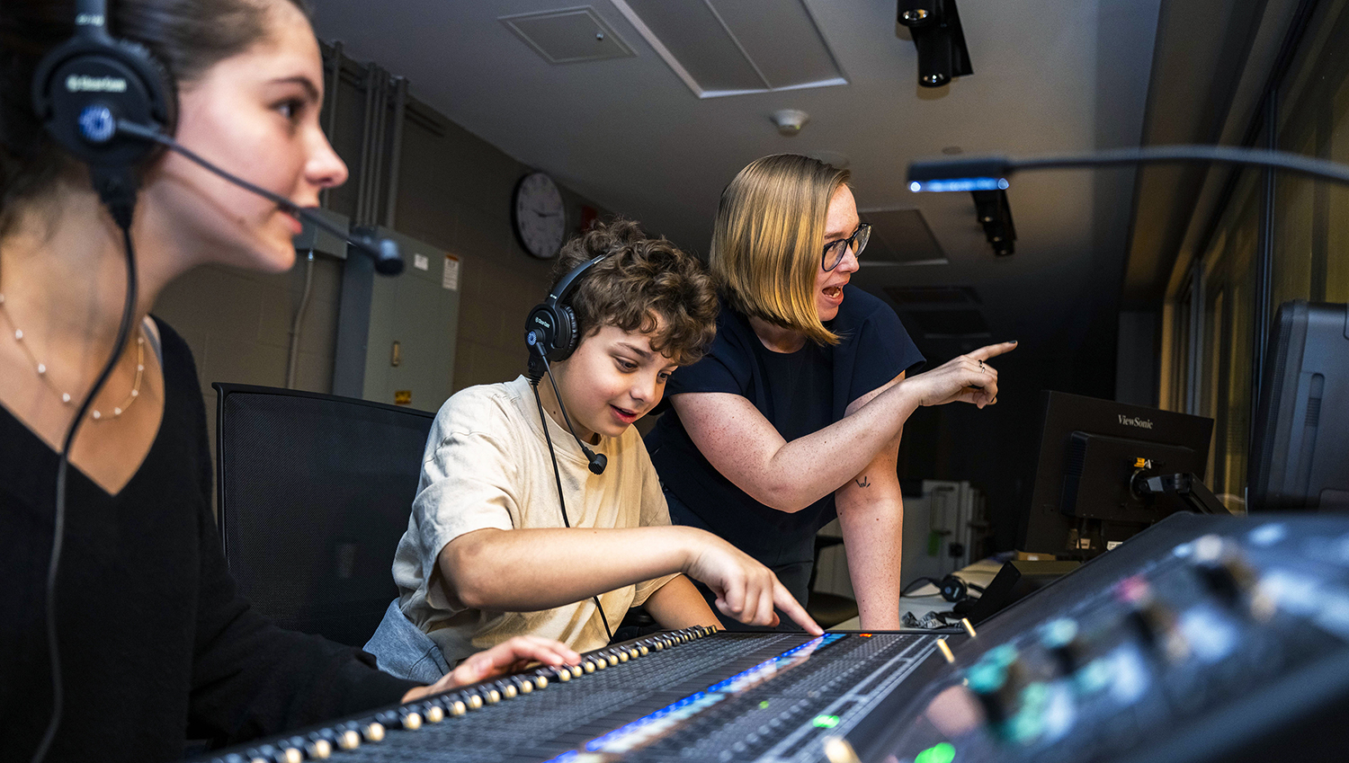 Technical Theatre Practicum student Ari Spiegel '26 (foreground), Sophia Frasco '29 and Tate W. '31 in the booth in Diller Hall.