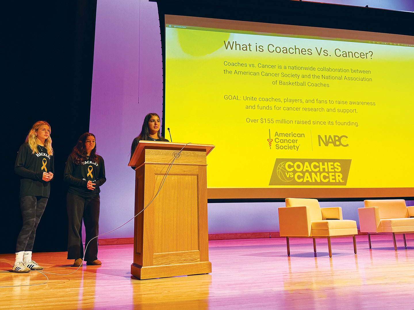 The students presented to the Upper School community in Diller Hall ahead of their fundraising bake sale and the Coaches vs. Cancer basketball tournament. Hackley then donated the funds raised to the American Cancer Society.